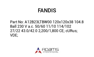 PLEASE CONTACT US TO ORDER TO GET THE BEST PRICE AND DELIVERY FOR FANDIS BRANDED A12B23LTBW00 120x120x38 104.8 Ball 230 V a.c. 50/60 11/10 114/102 27/22 43.0/42.0 2,200/1,800 CE; cURus; VDE; YOU MAY ASK FOR SOME OTHER PART NUMBER AS WELL. WE CAN OFFER BEST PRICE AND DELIVERY WITH WIDE PRODUCTS DISTRIBUTION NETWORK IN USA AND THROUGHOUT THE WORLD IN INDUSTRIAL PRODUCTS MARKET.